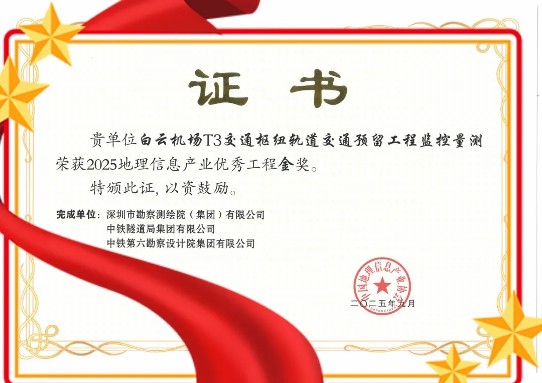 从T3航站楼启用时的“水门礼”迎接首航,到全运会开幕式客流集散考验,中铁六院测绘院的监测成果已转化为保障粤港澳大湾区“空铁联运”核心枢纽建设的新质生产力。此次获奖既彰显了中铁六院的技术实力,也是中铁六院脚踏实地服务国家重大战略的生动实践。