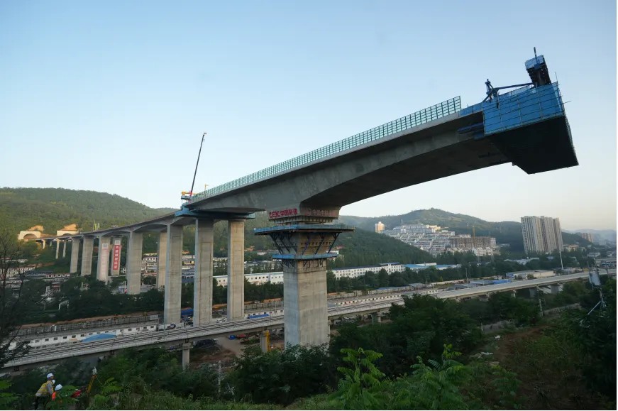 在工程建设中,主桥T构梁先在包西铁路西侧平行包西铁路、西延高铁(在建)方向挂篮悬浇,同时协同施工单位以墩身预埋钢构件搭设转体平台,解决高墩施工平台难题,后续再进行转体。这一流程最大限度保障包西铁路不间断运行,极大降低桥梁建设期间铁路安全风险,实现了铁路运营、高效施工、精准转体的共赢,创下目前世界范围内跨越运营铁路设计墩身高度最高、转体重量最大、跨度最大的新纪录,为同类工程提供范例,为革命老区交通建设注入强劲动力。