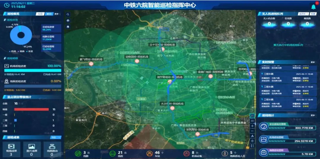 近日,中铁六院测绘院在南宁轨道交通1、2号线上创新实施无人机与人工协同巡检,将智能科技与地面巡查紧密结合,并通过AI算法对无人机采集的数据进行实时分析,精准识别地铁沿线的潜在风险点。这一模式为地铁安全运营提供了更为可靠的技术保障,成功开拓了低空经济新业务,构建起智能化、立体化、全天候的地铁安全防护网。